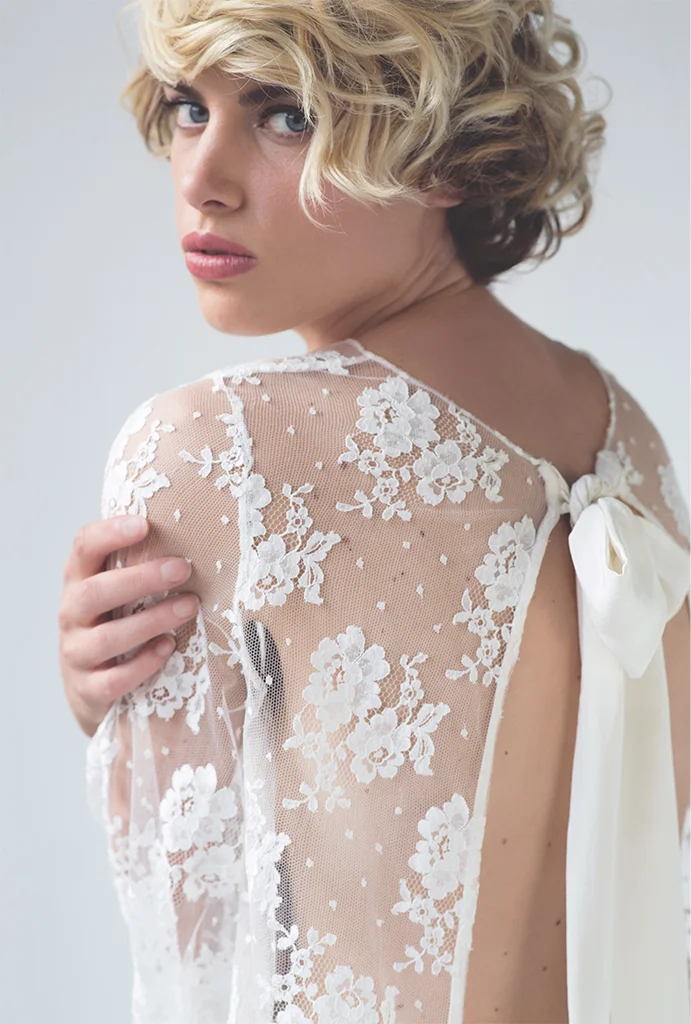 Imaginée au sein de notre showroom parisien, cette cape Alizée en dentelle de Calais sublimera votre silhouette.