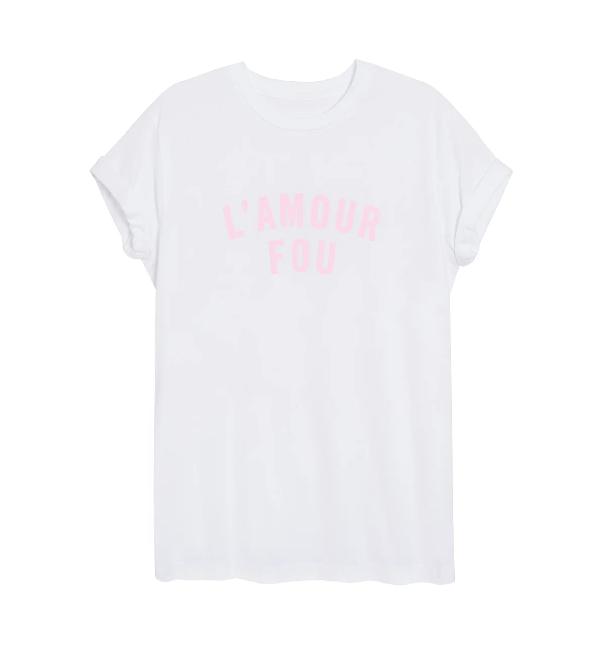 T-shirt blanc à manches courtes sérigraphié "L'AMOUR FOU" en rose, en France.